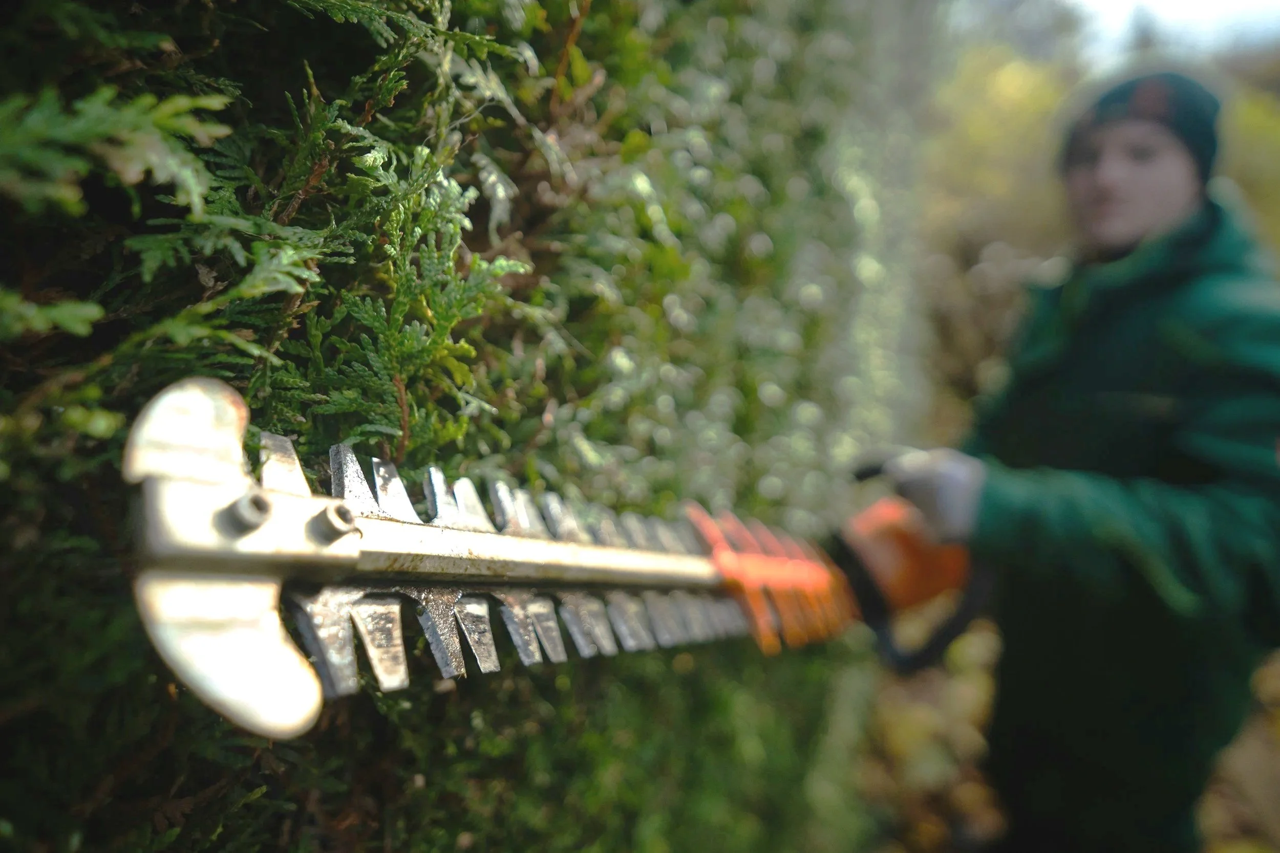 A person in outdoor green and black clothing and gloves holding a hedge trimmer, trimming a hedge with small green leaves.