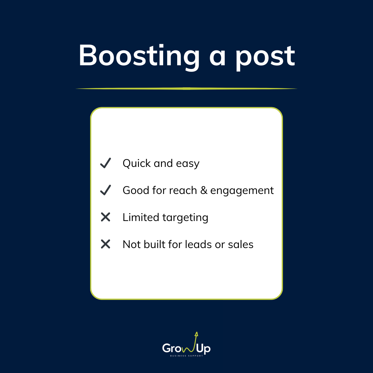Boosting a post is essentially paying to show a post you’ve already shared to a wider audience. It’s simple: choose your post, select your target audience, and set a budget. Boosting works well when: